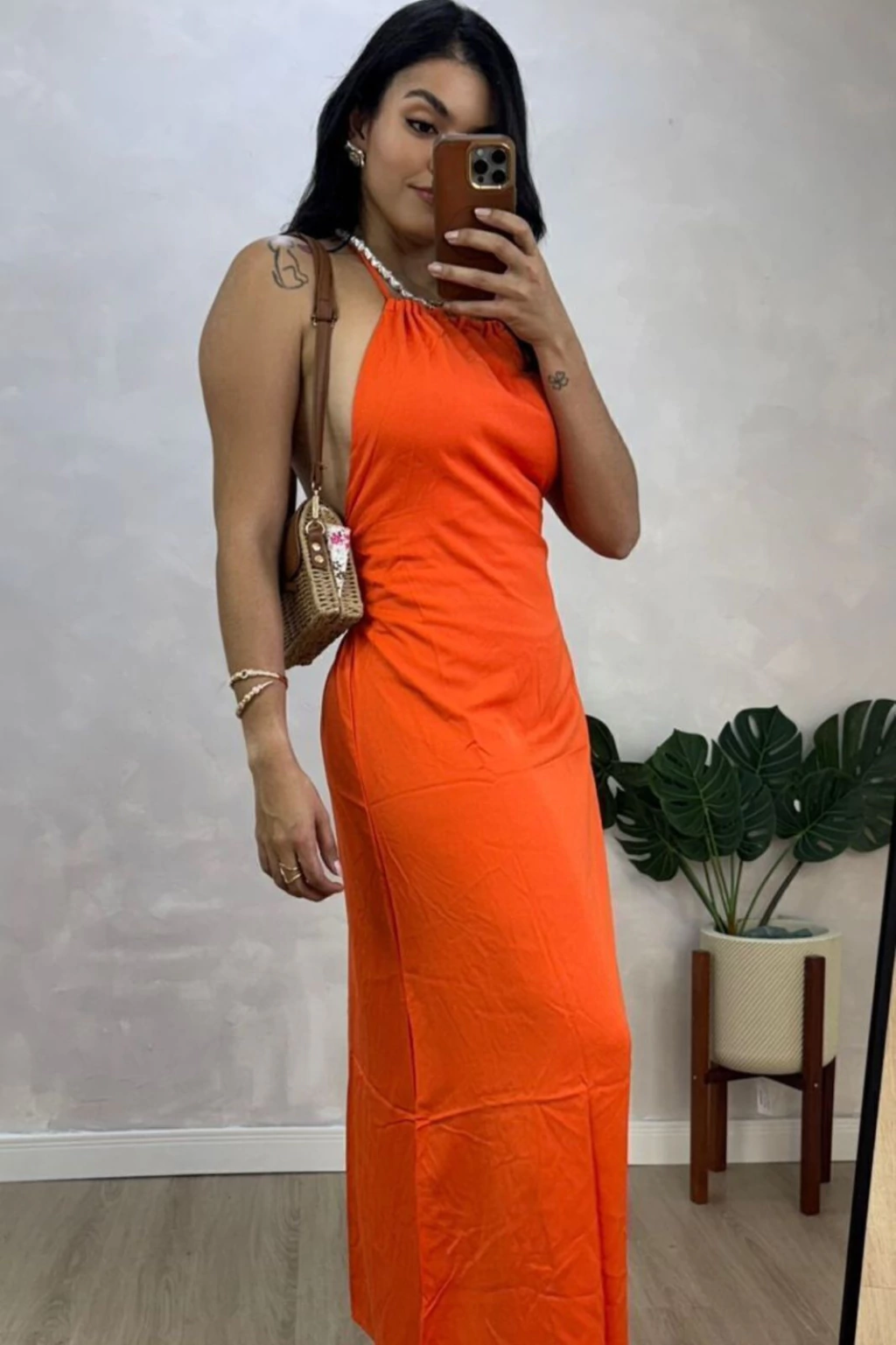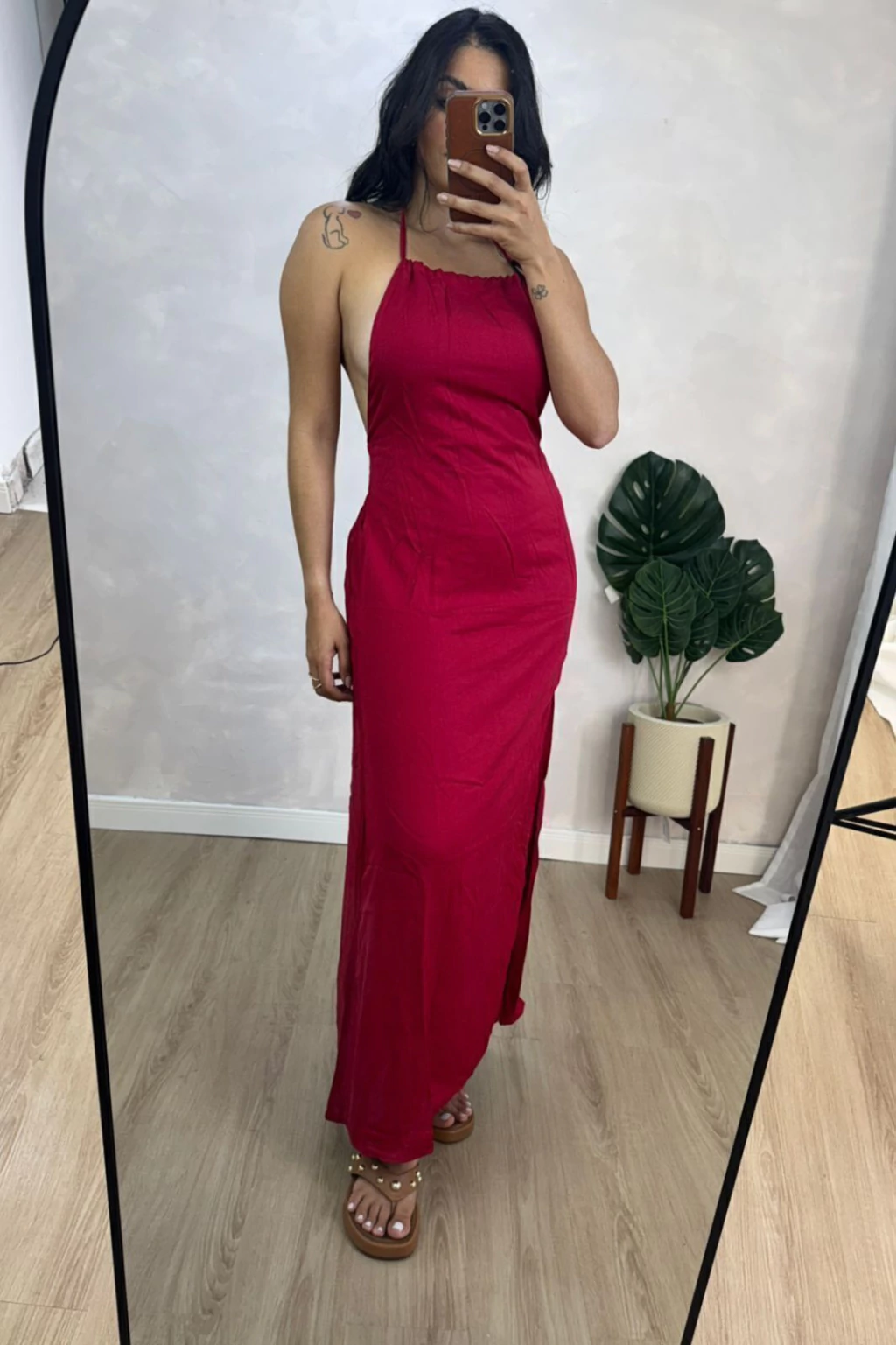 Esse vestido longo é perfeito para quem ama looks marcantes e femininos. Com alças finas e decote franzido, ele valoriza o colo de forma delicada. A fenda lateral e o decote nas costas traz um toque de ousadia e leveza ao movimento.